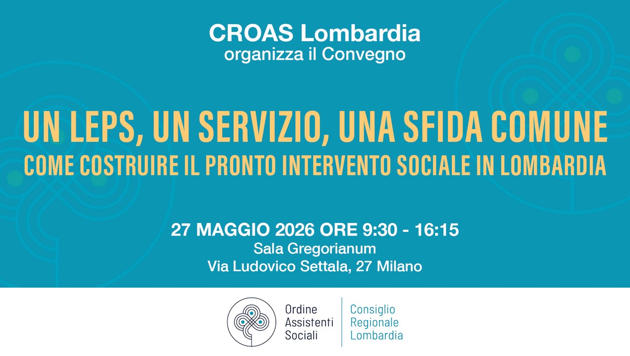 27.5. 2026: Convegno CROAS “Un LEPS, un servizio, una sfida comune.Come costruire il Pronto Intervento Sociale in Lombardia”, dalle 09.30 alle 16.15
