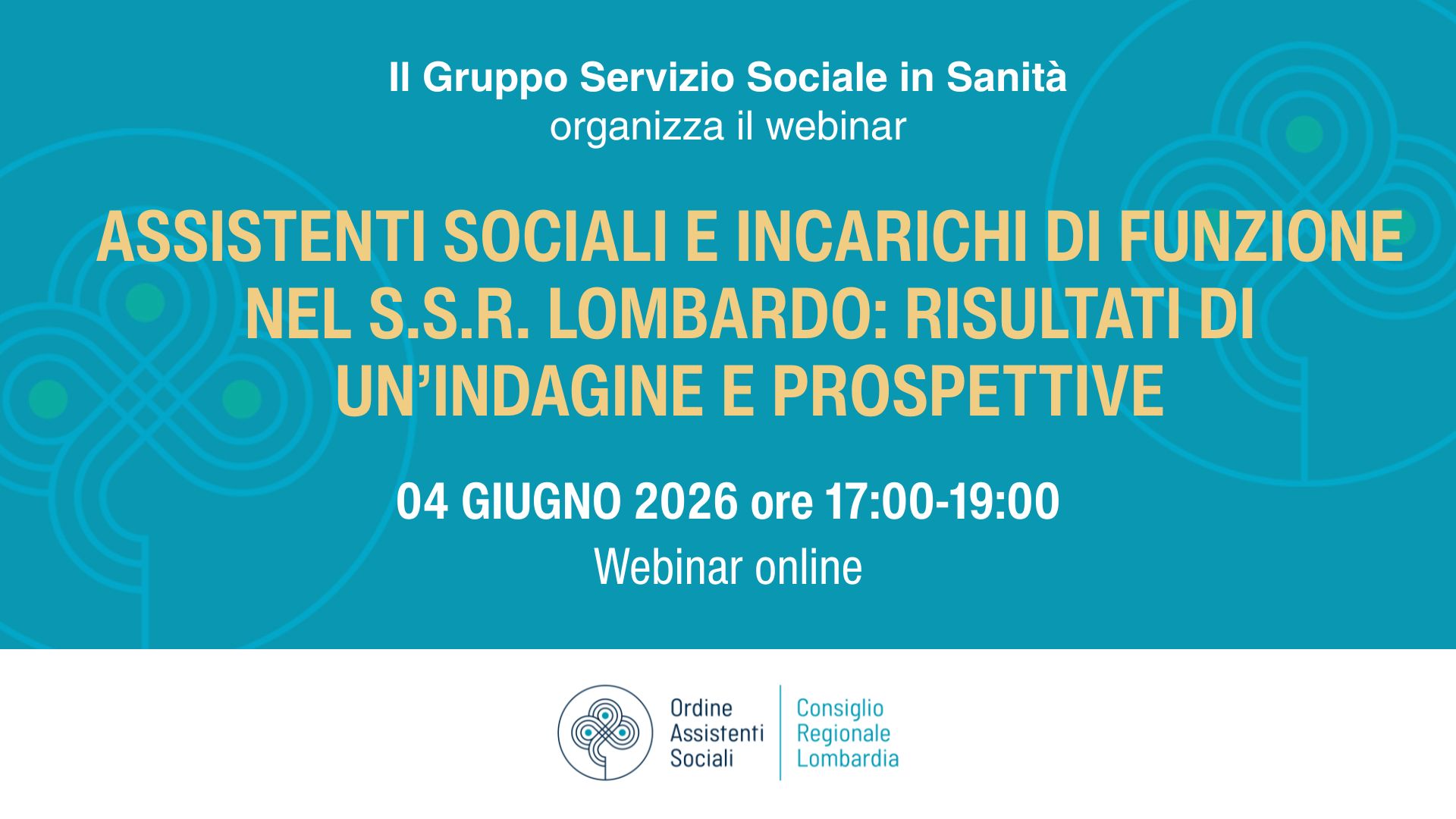 04.06.2026: Webinar “Assistenti sociali e incarichi di funzione nel SSR lombardo: risultati di un’indagine e prospettive”, organizzato dal Gruppo Servizio Sociale Professionale in Sanità dell’Ordine Regionale Assistenti Sociali della Lombardia.