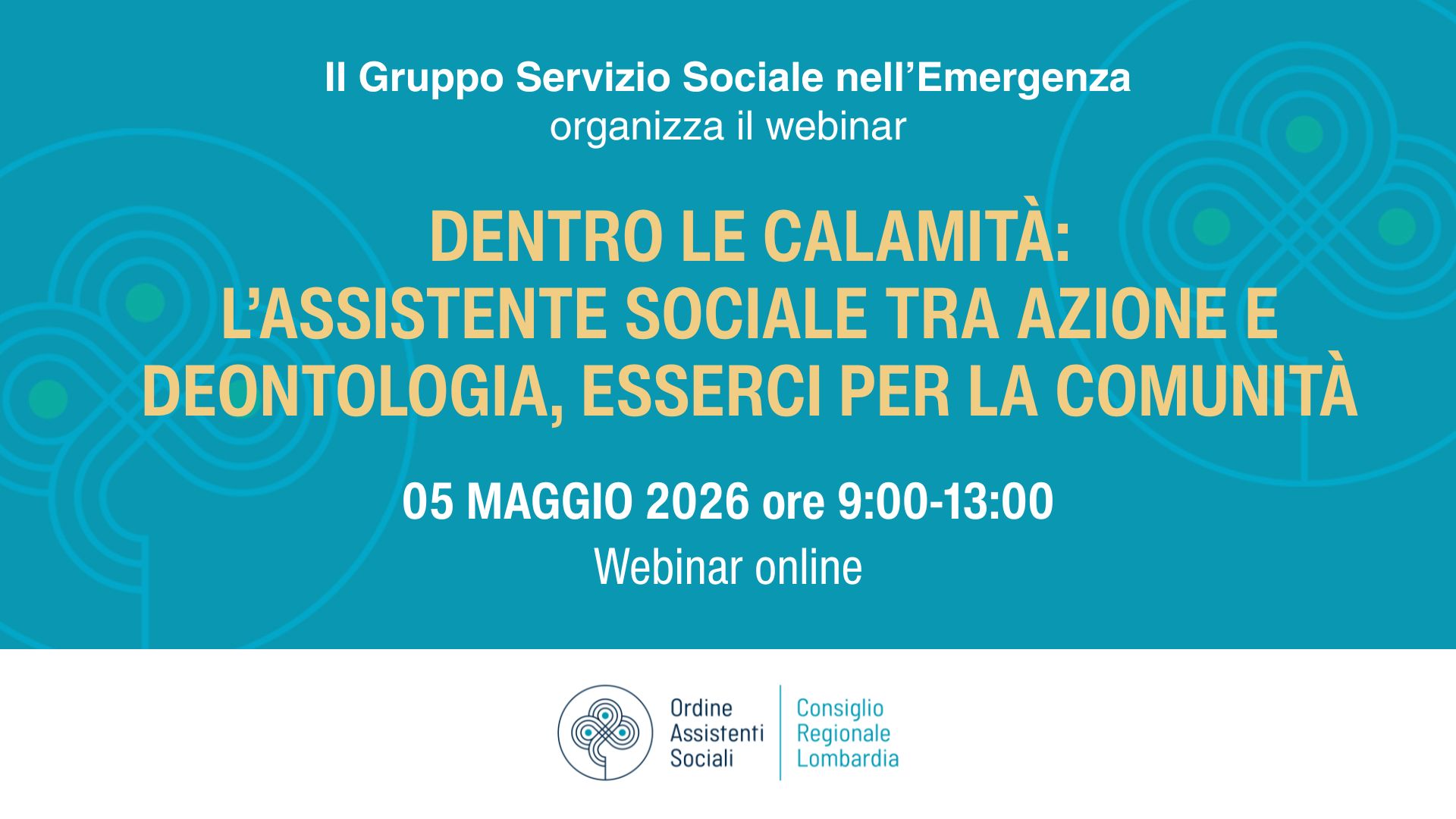5.5.2026: Webinar “DENTRO LE CALAMITA’: l’assistente sociale tra azione e deontologia, esserci per la comunità”, organizzato dal Gruppo Tematico Servizio Sociale nell’Emergenza dell’Ordine Regionale Assistenti Sociali della Lombardia, dalle 9:00 alle 13:00
