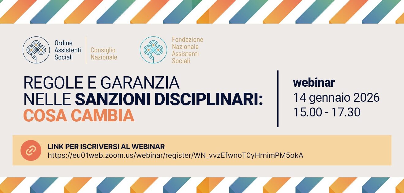 Il prossimo 14 gennaio 2026, il Consiglio Nazionale dell’Ordine degli Assistenti Sociali, in collaborazione con la Fondazione Nazionale Assistenti Sociali, presenta un incontro fondamentale per fare chiarezza sulle nuove regole e garanzie nelle sanzioni disciplinari.
